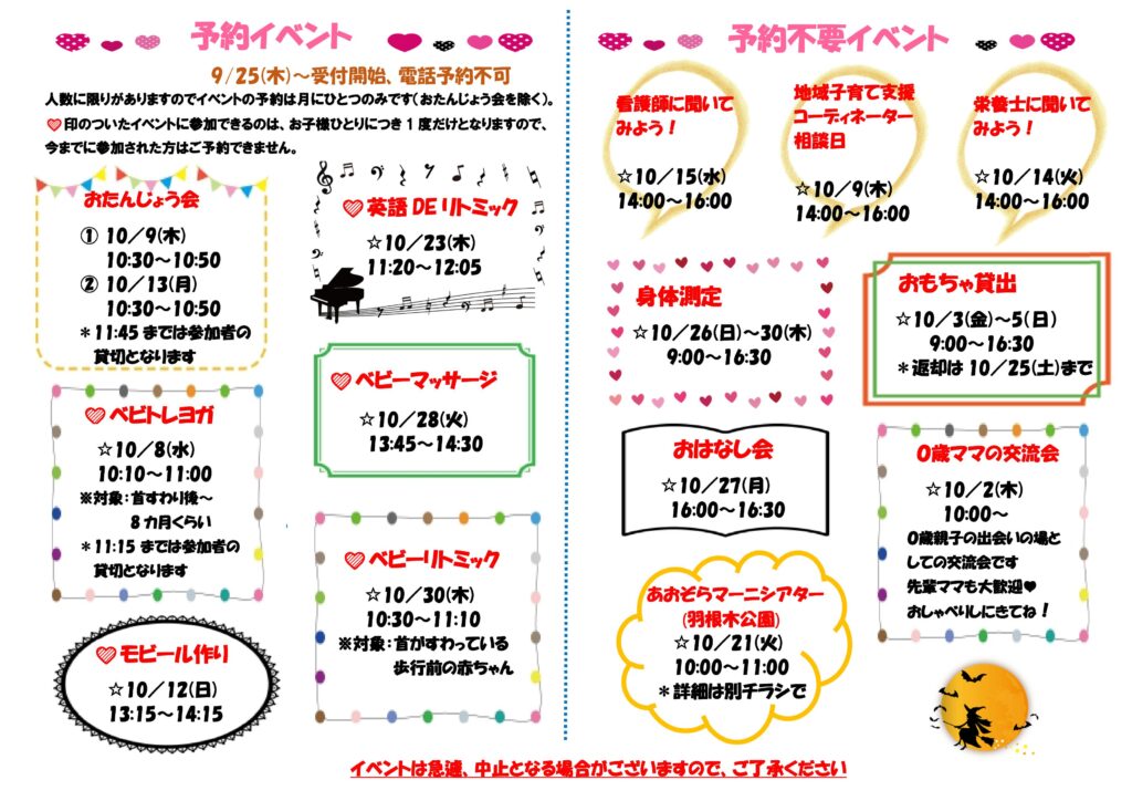 スタッフが常駐し、子育ての相談や子育てに関する情報の提供を行います。また、定期的に各種イベントを開催しています。